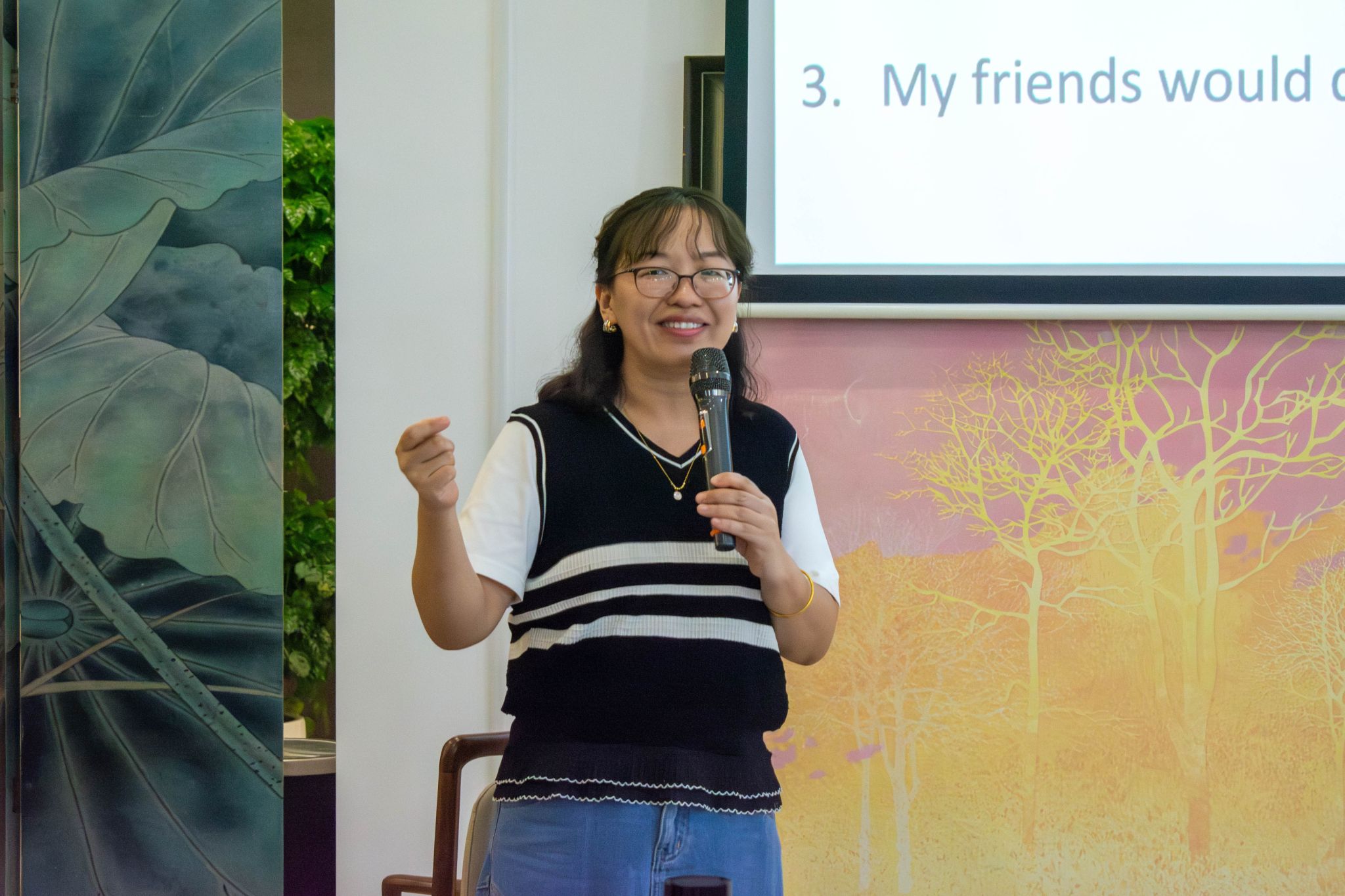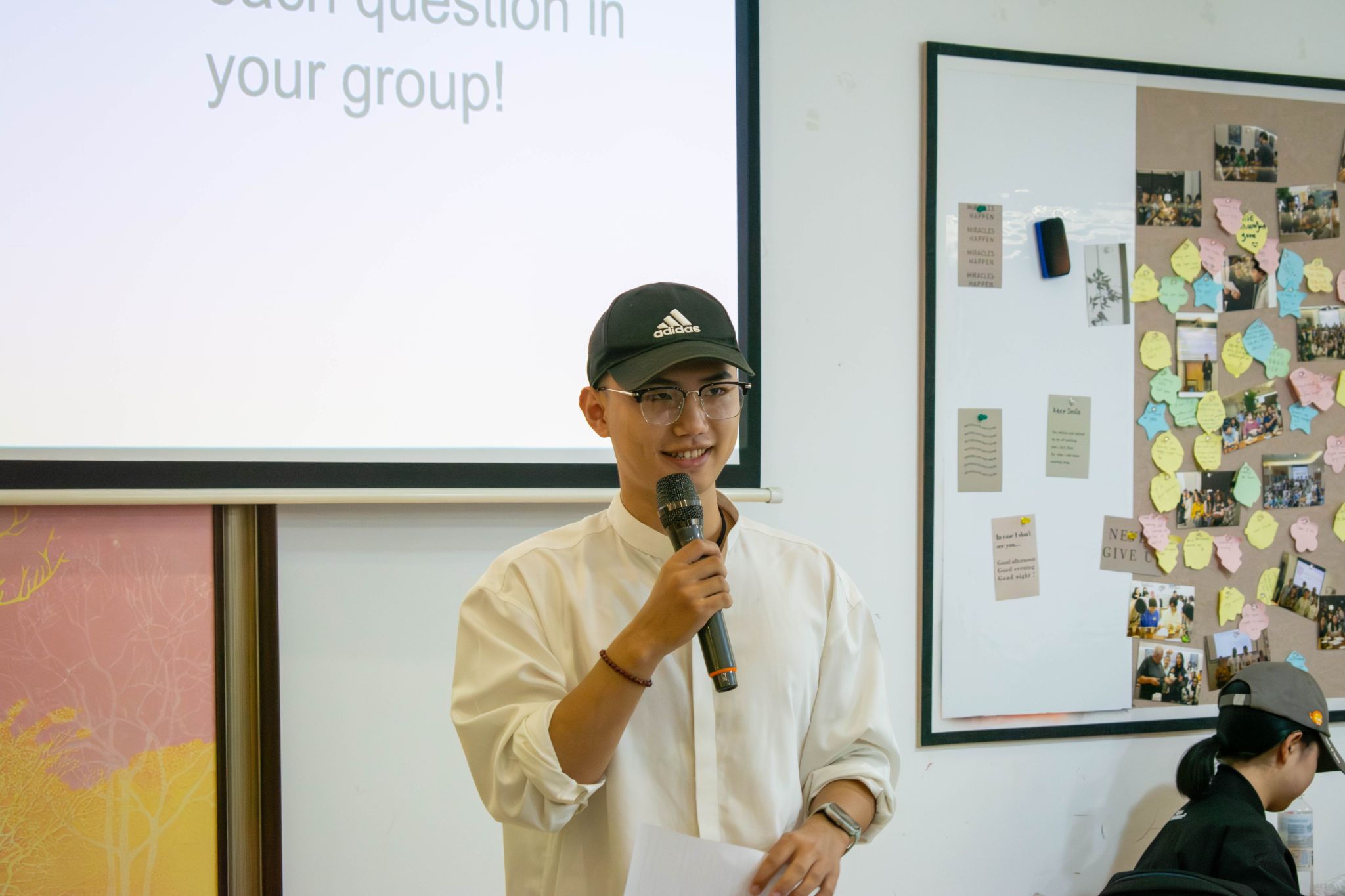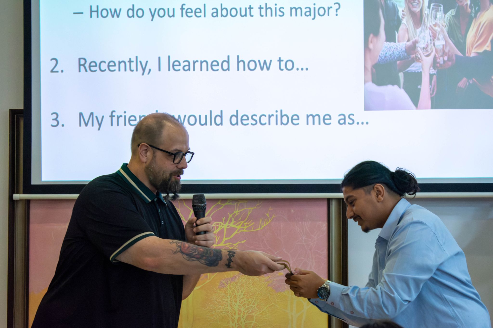 最后,在外教Kay与学生的互动的环节中,现场气氛变得格外轻松活泼。他引导大家讨论适合与朋友见面的地点,从熟悉的食堂、教室、图书馆,到充满文化差异的夜店、酒吧,引发了阵阵欢笑与好奇。随后,他鼓励同学们向伙伴介绍自己的专业、分享所学所得,并让朋友用词来形容自己,将语言练习融入真实的互动与趣味的自我探索之中。