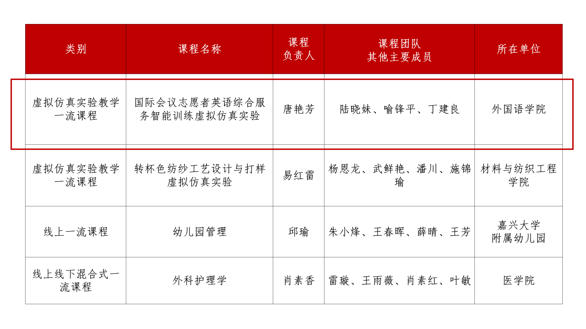 近日,教育部公布第三批国家级一流本科课程认定结果,嘉兴大学4门课程入选,涵盖多个课程类型,充分体现了我校在课程建设和教学改革方面的扎实进展与显著成效。其中外国语学院唐艳芳、陆晓妹、喻锋平、丁建良团队的《国际会议志愿者英语综合服务智能训练虚拟仿真实验》课程成功获批国家级一流本科课程(社会实践一流课程)!这是我院本科课程建设取得的又一重大突破!