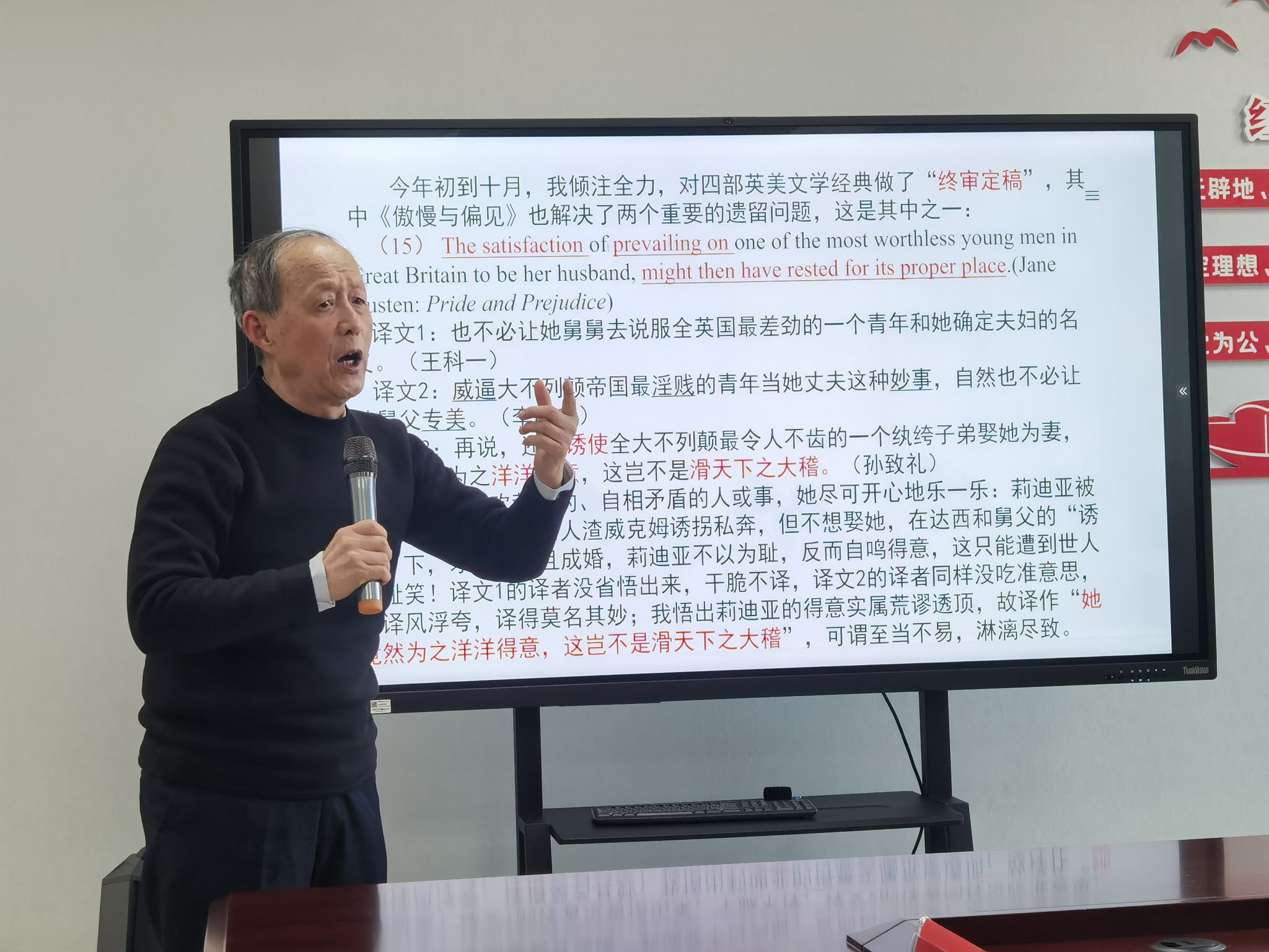 11月21日下午,我国著名翻译家及翻译理论家、中国翻译协会“翻译文化终身成就奖”获得者孙致礼教授应邀为外国语学院师生作题为“我的英美文学翻译之道”的学术讲座。孙致礼教授是原解放军外国语学院英语语言文学专业学术带头人、博士生导师,代表性译著《傲慢与偏见》《瓦尔登湖》《老人与海》等脍炙人口、长销不衰。本次讲座由院长唐艳芳主持,学院教师代表及翻译专业硕士研究生三十余人参加。