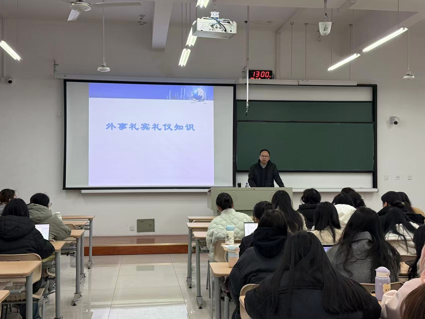 2025年11月28日,浙江省人民政府外事办公室经济与新闻处张汶处长应邀莅临嘉兴大学外国语学院,为高年级本科生、翻译专业硕士研究生及教师代表五十余人,作题为“外事礼宾礼仪知识”的专题讲座。