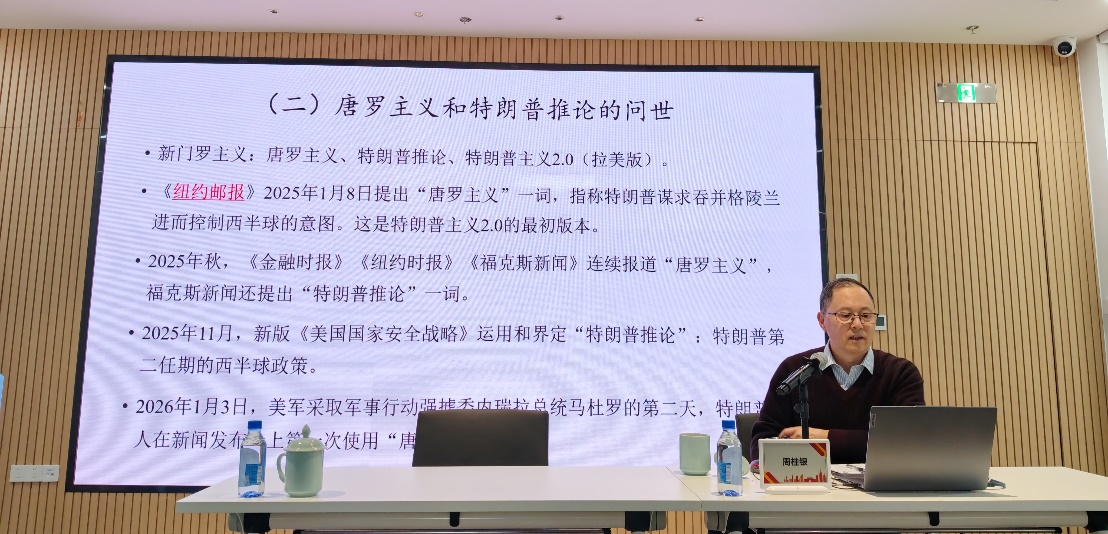 讲座中,周桂银系统梳理了美国拉美政策的演变脉络,重点剖析特朗普政府时期“新门罗主义”的兴起与发展。他指出,从传统“门罗主义”到特朗普政府相关政策,美国对拉美政策始终以干涉、控制为核心主线,特朗普政府秉持“美国优先”“美洲优先”理念,将西半球视为其主导的“后院”。