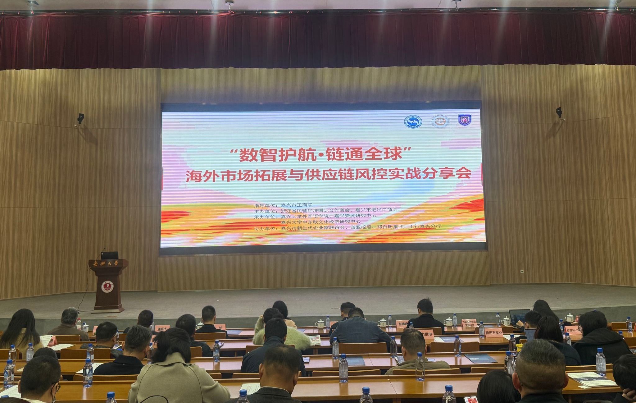 为助力外贸企业出海破局,智慧化解贸易风险,高效融入全球供应链体系,12月11日,“数智护航·链通全球”——海外市场拓展与供应链风控实战分享会在我校顺利举办。本次活动在嘉兴市工商联的指导下,由嘉兴市进出口商会联合浙江省民营经济国际合作商会共同主办,嘉兴大学外国语学院、嘉兴安澜研究中心、嘉兴大学中东欧文化经济研究中心承办,嘉兴市新生代企业家联谊会、诺亚控股、邓白氏、工商银行协办,吸引了70余位外贸企业代表参加,共探出海发展新路径。