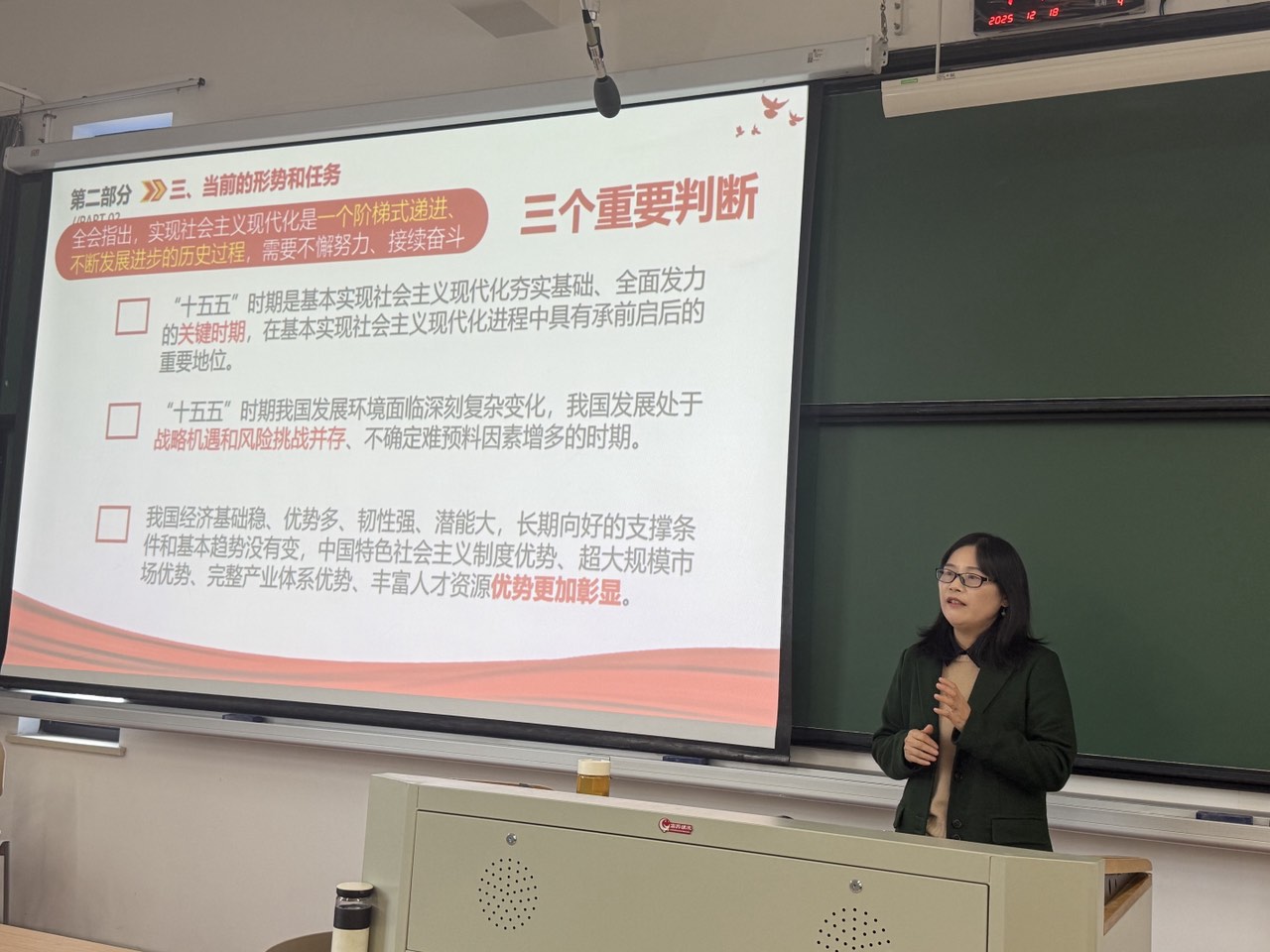 学校理论宣讲团专家、马克思主义学院许惠芬教授应邀做专题宣讲。她围绕党的二十届四中全会的重大意义、核心要义、精神实质和实践要求进行了全面系统、深入浅出的解读。紧密结合当前国际国内形势,运用鲜活案例和详实数据,深刻阐述了全会提出的一系列新思想、新论断、新部署,并重点解读了“十五五”时期经济社会发展的指导思想、基本原则、主要目标及重点领域部署。