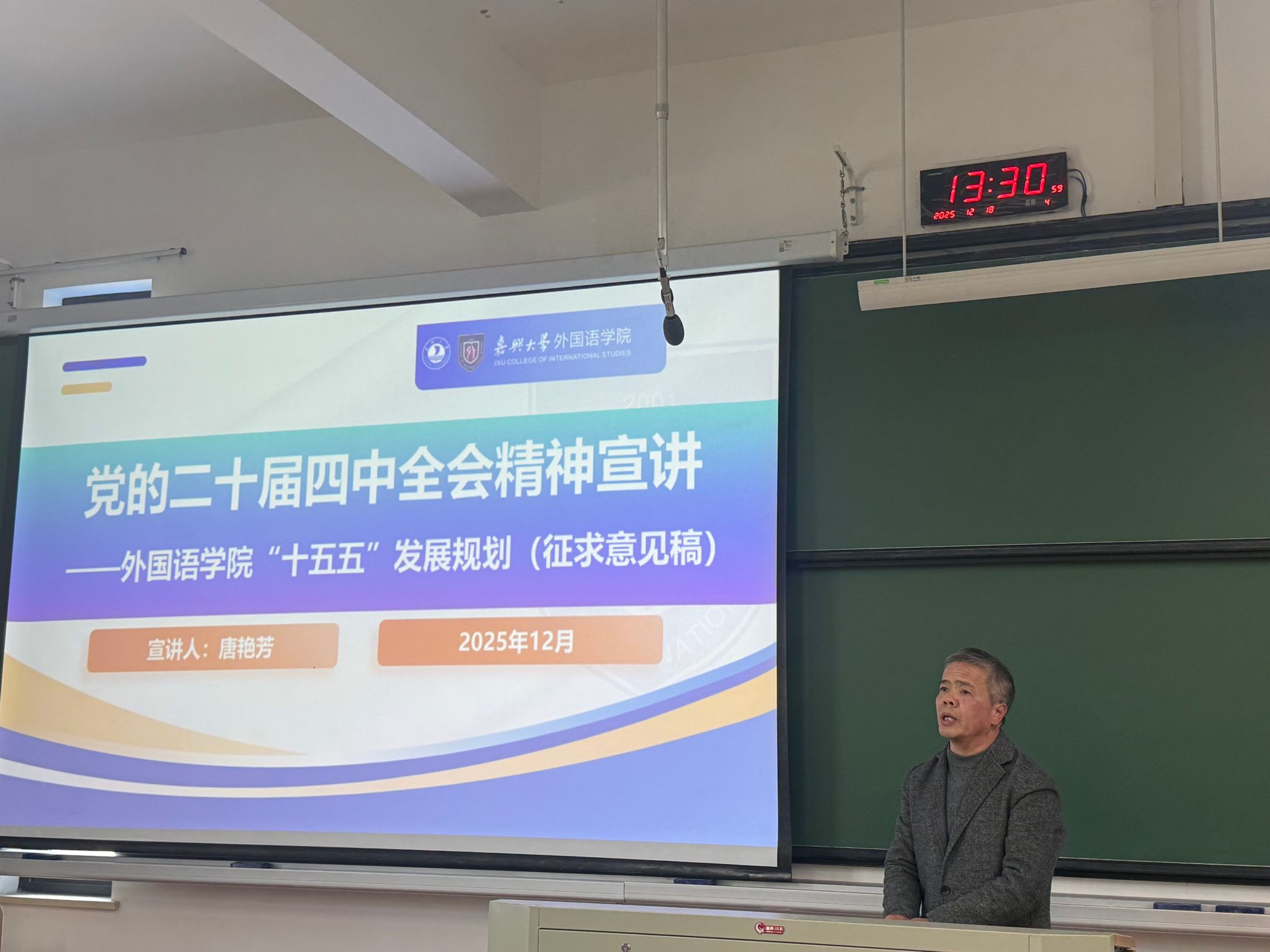 12月18日,外国语学院举行学习贯彻党的二十届四中全会精神专题宣讲会。宣讲会由党委书记刘巧芝主持,学院党政领导班子成员、全体教职工参加会议。
